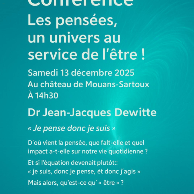 Conférence du Dr Jean-Jacques DewitteJe pense donc je suis Le samedi 13 décembre 2025 à 14h30Au château de Mouans-Sartoux D’où vient la pensée? Que fait-elle et quel impact a-t-elle sur notre vie quotidienne? Et si l’équation devenait plutôt: « Je suis,…