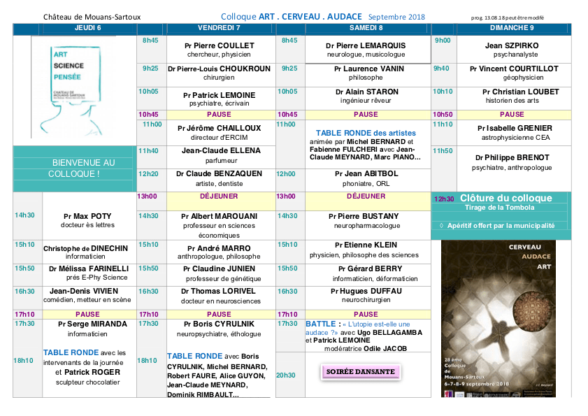 Bonjour, J’ai le plaisir de vous annoncer notre prochain Colloque 2018 qui aura pour thème: « Art • Audace • Cerveau » du 6 au 9 septembre au Château de Mouans-Sartoux : Je vous rappelle également nos prochaines conférences pour le deuxième trimestre:…
