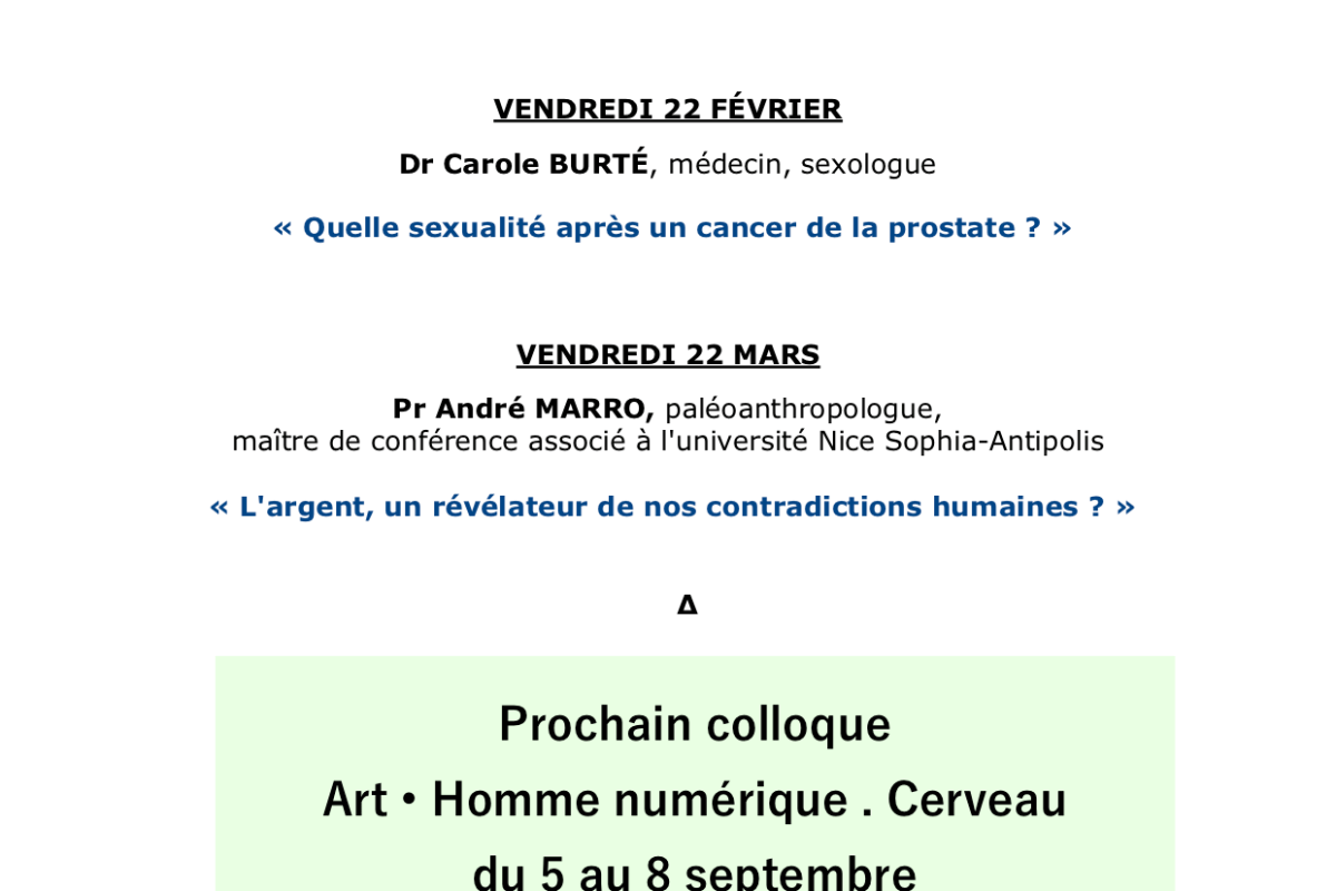 Chers adhérents, J’ai le plaisir de vous rappeler nos prochaines conférences printanières : VENDREDI 22 MARS 20H SALLE HONEGGER. « L’argent, un révélateur de nos contradictions humaines ? » Pr André MARRO, paléoanthropologue, Maître de conférences associé à l’université Nice Sophia-Antipolis…